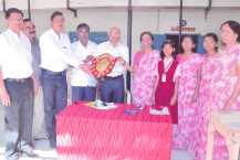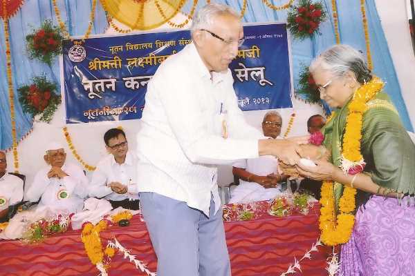 - नूतनीकरण सोहळ्यात देणगीदार तथा प्रशालेच्या पहिल्या मुख्याध्यापिका श्रीमती पागे यांच्या संस्थेचे अध्यक्ष डॉ. लोया यांच्या हस्ते सत्कार